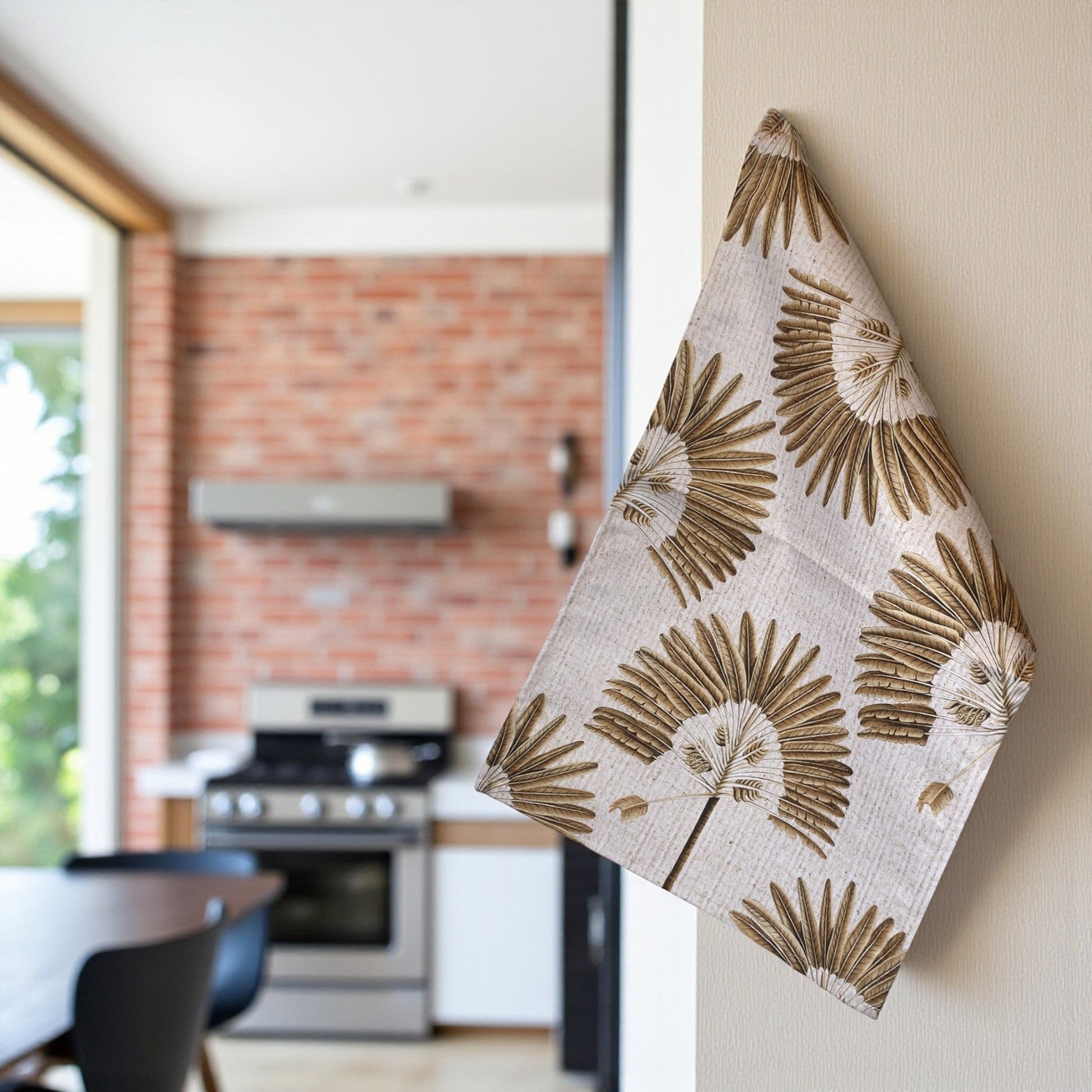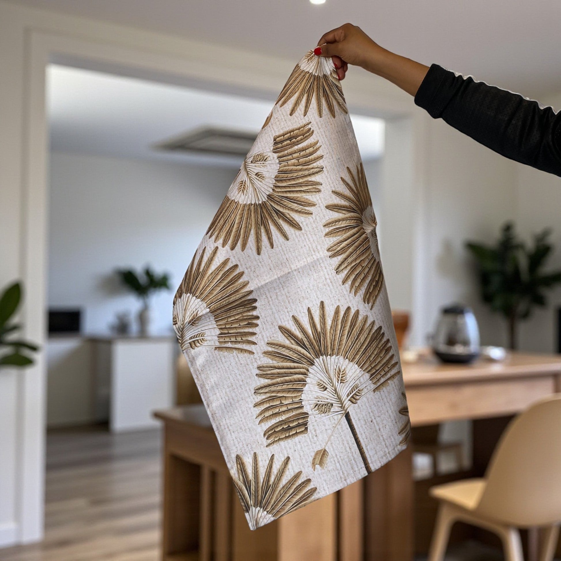 Refined and radiant, this tea towel showcases golden palms on a soft neutral base. Effortless style for everyday use.